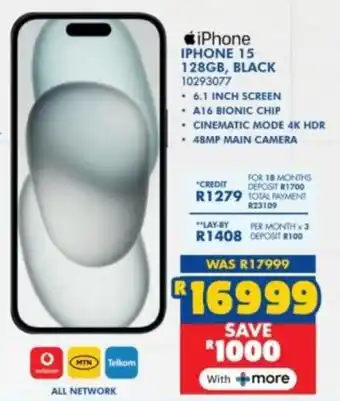 This special is available in various stores, view all products to get the cheapest iPhone 15 128GB Black. If you'd like to find out whether this product has a bigger discount in another store, check the category 'Home furniture'. You may also find these specials interesting: iPhone 13 128GB Black Pre Owned, iPhone 15 128GB + iPhone 15 128GB & iPhone 15 128GB.