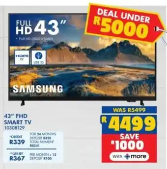 This special is available in various stores, view all products to get the cheapest Samsung 43" FHD Smart TV. If you'd like to find out whether this product has a bigger discount in another store, check the category 'Home furniture'. You may also find these specials interesting: Samsung 43-inch FHD Smart TV, Samsung 43 FHD LED Smart TV UA43F60 (850029867) & 43” FHD Smart TV.