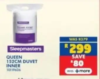 This special is available in various stores, view all products to get the cheapest Sleepmasters queen 152cm duvet inner. If you'd like to find out whether this product has a bigger discount in another store, check the category 'Home furniture'. You may also find these specials interesting: Sleepmasters Queen Size Duvet Inner, Ultrafine Microfibre Duvet Inner Range & Sleepmasters 152cm Queen Bed Set.