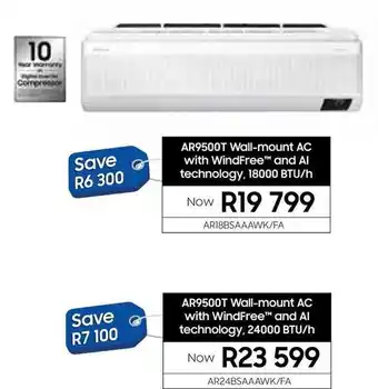 The Samsung AR9500T Wall-mount AC with WindFree and AI technology, 24000 BTU/h promotion runs from 19-01-2026 to 23-02-2026. If it has ended, don’t worry — you can view other similar specials. Follow the product category to be notified as soon as Samsung AR9500T Wall-mount AC with WindFree and AI technology, 24000 BTU/h is available again. Comparing Samsung AR9500T Wall-mount AC with WindFree and AI technology, 24000 BTU/h promotions helps you decide whether it's worth waiting for a lower price in a future offer. Keep checking our site for upcoming promotions.
