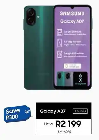 This special is available in various stores, view all products to get the cheapest Samsung Galaxy A07 128GB. If you'd like to find out whether this product has a bigger discount in another store, check the category 'Electronics'. You may also find these specials interesting: Samsung Galaxy A36 5G, Samsung Galaxy A36 5G & Samsung Galaxy A06.