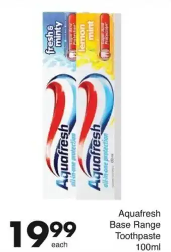 This special is available in various stores, view all products to get the cheapest Aquafresh Base Range Toothpaste. If you'd like to find out whether this product has a bigger discount in another store, check the category 'Grocery stores'. You may also find these specials interesting: AQUAFRESH TOOTHPASTE, Aquafresh Toothpaste Assorted & Aquafresh Toothpaste Assorted 100ml.