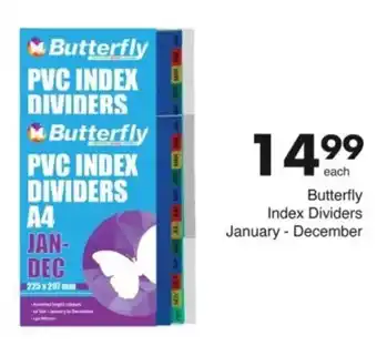 This special is available in various stores, view all products to get the cheapest Butterfly Index Dividers January-December. If you'd like to find out whether this product has a bigger discount in another store, check the category 'Grocery stores'. You may also find these specials interesting: Croxley A4 File Dividers, Aro File Dividers & Croxley A4 no index lever arch file.