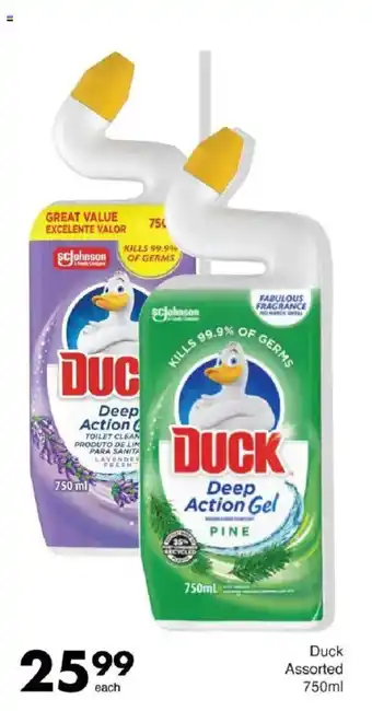 This special is available in various stores, view all products to get the cheapest Duck Assorted. If you'd like to find out whether this product has a bigger discount in another store, check the category 'Grocery stores'. You may also find these specials interesting: Duck Assorted, DUCK Toilet Cleaner & Duck Toilet Cleaner.