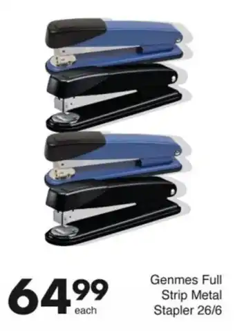 This special is available in various stores, view all products to get the cheapest Genmes Full Strip Metal Stapler. If you'd like to find out whether this product has a bigger discount in another store, check the category 'Grocery stores'. You may also find these specials interesting: Kangaro Full Strip Metal Stapler (592293), Treeline Stapler Full Strip (20 Sheets)Metal In Assorted Colours & Scripto Stapler Metal Half Strip-1s.