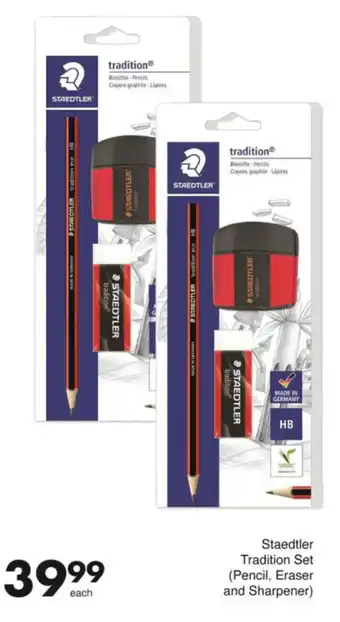This special is available in various stores, view all products to get the cheapest Staedtler Tradition Set Pencil, Eraser and Sharpener. If you'd like to find out whether this product has a bigger discount in another store, check the category 'Grocery stores'. You may also find these specials interesting: Staedtler Tradition Set Pencil, Eraser and Sharpener, Staedtler Tradition HB Pencil, Eraser and Double-Hole Sharpener Set & Staedtler Eraser Tradition.