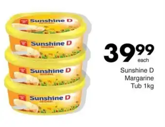 This special is available in various stores, view all products to get the cheapest Sunshine D Margarine Tub. If you'd like to find out whether this product has a bigger discount in another store, check the category 'Grocery stores'. You may also find these specials interesting: Sunshine D Margarine Tub, Sunshine D Margarine & Sunshine d original margarine.
