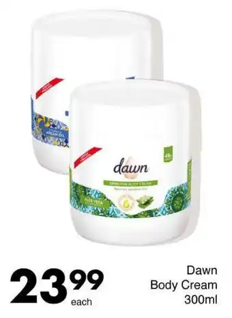 This special is available in various stores, view all products to get the cheapest Dawn Body Cream. If you'd like to find out whether this product has a bigger discount in another store, check the category 'Grocery stores'. You may also find these specials interesting: Dawn Body Lotion, Dawn Body Lotion & Dawn Body Lotion Assorted.