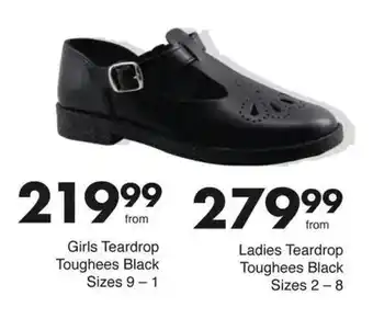 This special is available in various stores, view all products to get the cheapest Girls Teardrop Toughees Black. If you'd like to find out whether this product has a bigger discount in another store, check the category 'Grocery stores'. You may also find these specials interesting: Toughees Girls One Bar Shoe, Girls T-Bar Toughees Brown & Youth Lace Up Toughees Black.