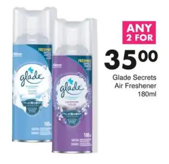 This special is available in various stores, view all products to get the cheapest Glade Secrets Air Freshener. If you'd like to find out whether this product has a bigger discount in another store, check the category 'Grocery stores'. You may also find these specials interesting: GLADE SECRETS AIR FRESHENER 180ml each, Glade Secrets Air Freshener Assorted 180ml & Glade Secrets Air Freshener Assorted 180ml.