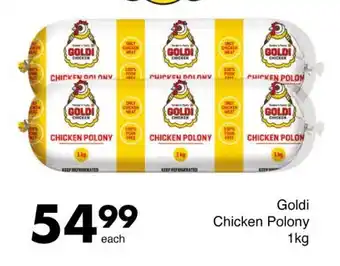 This special is available in various stores, view all products to get the cheapest Goldi Chicken Polony. If you'd like to find out whether this product has a bigger discount in another store, check the category 'Grocery stores'. You may also find these specials interesting: Goldi Chicken Burgers, Goldi Chicken Schnitzels & Goldi Chicken Nuggets.