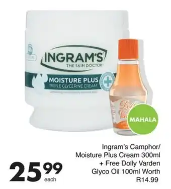 This special is available in various stores, view all products to get the cheapest Ingram's Camphor/ Moisture Plus Cream. If you'd like to find out whether this product has a bigger discount in another store, check the category 'Grocery stores'. You may also find these specials interesting: Ingram's Camphor/ Moisture Plus Cream, INGRAM'S Cream & INGRAM'S Cream.