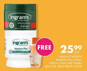 This special is available in various stores, view all products to get the cheapest Ingram's Camphor/ Moisture Plus Cream. If you'd like to find out whether this product has a bigger discount in another store, check the category 'Grocery stores'. You may also find these specials interesting: Ingram's camphor cream, Ingram's Camphor Cream & INGRAM'S Cream.