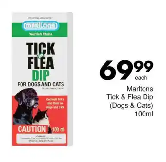 This special is available in various stores, view all products to get the cheapest Marltons Tick & Flea Dip. If you'd like to find out whether this product has a bigger discount in another store, check the category 'Grocery stores'. You may also find these specials interesting: Spencers Tick & Flea Collar for Dogs/ Cats, Bob Martin Tick & Flea Powder Dog & Lancewood Dip delite or Dip & Top.