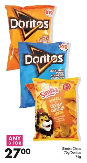 This special is available in various stores, view all products to get the cheapest Simba Chips/ Doritos. If you'd like to find out whether this product has a bigger discount in another store, check the category 'Grocery stores'. You may also find these specials interesting: LAYS 120g / DORITOS / SIMBA 120g / Chipniks Snack Chips Assorted 100g, Simba Lays/ Doritos & Simba Doritos/ Lay's.