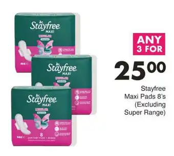 This special is available in various stores, view all products to get the cheapest Stayfree Maxi Pads. If you'd like to find out whether this product has a bigger discount in another store, check the category 'Grocery stores'. You may also find these specials interesting: Stayfree maxi sanitary pads, Stayfree Maxi Pads Assorted 8s Or 10s Pack-For Any 2 & STAYFREE Maxi Pads Assorted/ Pantyliners Assorted.