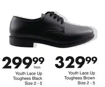This special is available in various stores, view all products to get the cheapest Youth Lace Up Toughees Black. If you'd like to find out whether this product has a bigger discount in another store, check the category 'Grocery stores'. You may also find these specials interesting: Men's Lace Up Toughees Black, Boys Lace Up Toughees & Men's Lace Up Toughees Brown.