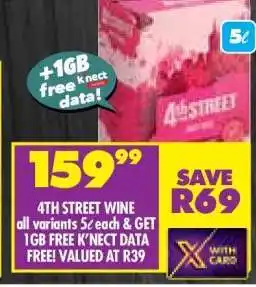 The price of 4th Street Wine can be found at the top of the page, together with the dates during which the special is available. You can also check the price in the current Shoprite catalogue or on the Shoprite website. Promotional offers assure you of buying Shoprite products at the lowest price.