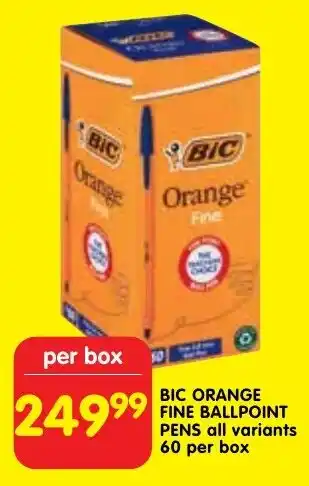Shoprite offers a wide collection of products, besides the Bic orange fine ballpoint pens. Keep an eye on the weekly Shoprite catalogue to find the best specials and promotions. Besides Bic orange fine ballpoint pens, you can also find the following offers: BIC Orange Fine Ballpoint Pens, BIC ORANGE FINE BALLPOINT PENS all variants 60 per box & BIC Orange Fine Ballpoint Pens 3+2 FREE Pack Assorted Colours Each.