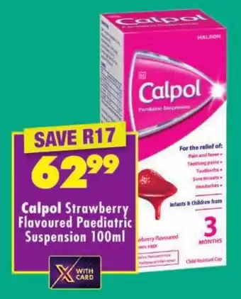 The price of Calpol Strawberry Flavoured Paediatric Suspension can be found at the top of the page, together with the dates during which the special is available. You can also check the price in the current Shoprite catalogue or on the Shoprite website. Promotional offers assure you of buying Shoprite products at the lowest price.