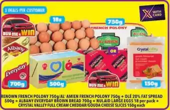 RENOWN FRENCH POLONY 750g/ AL' AMIEN FRENCH POLONY 750g + OLÉ 20% FAT SPREAD 500g + ALBANY EVERYDAY BROWN BREAD 700g + NULAID LARGE EGGS 18 per pack + CRYSTAL VALLEY FULL CREAM CHEDDAR/ GOUDA CHEESE SLICES 150g each