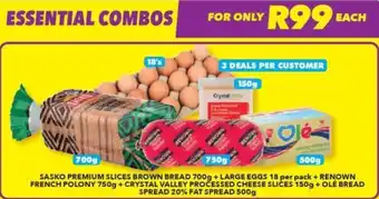 SASKO PREMIUM SLICES BROWN BREAD 700g + LARGE EGGS 18 per pack + RENOWN FRENCH POLONY 750g + CRYSTAL VALLEY PROCESSED CHEESE SLICES 150g + OLÉ BREAD SPREAD 20% FAT SPREAD 500g