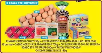 RENOWN FRENCH POLONY 750g + RITEBRAND/TOPLAY/ FARMYARD/ NULAID LARGE EGGS 18 per tray + SASKO MORE SLICES BROWN BREAD 700g + OLÉ BREAD SPREAD 20% FAT SPREAD or RONDO 37% FAT SPREAD 500g + CRYSTAL VALLEY GOUDA/ CHEDDAR CHEESE SLICES 150g