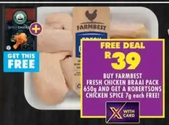 BUY FARMBEST FRESH CHICKEN BRAAI PACK 650g AND GET A ROBERTSONS CHICKEN SPICE 7g each FREE