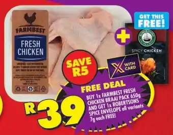 BUY 1x FARMBEST FRESH CHICKEN BRAAI PACK 650g AND GET 1x ROBERTSONS SPICE ENVELOPE all variants 7g each FREE
