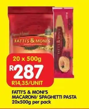 This special is available in various stores, view all products to get the cheapest Fatti's & Moni's Macaroni/Spaghetti Pasta. If you'd like to find out whether this product has a bigger discount in another store, check the category 'Grocery stores'. You may also find these specials interesting: Fatti's & Moni's Macaroni/Spaghetti Pasta 500g, Fatti's & moni's pasta macaroni/ spaghetti & Fatti's & moni's macaroni or spaghetti.
