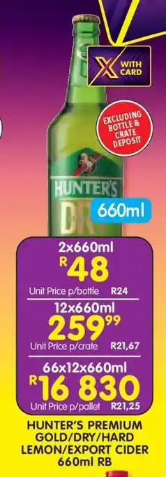 HUNTER'S PREMIUM GOLD/DRY/HARD LEMON/EXPORT CIDER 660ml RB promotion at Shoprite