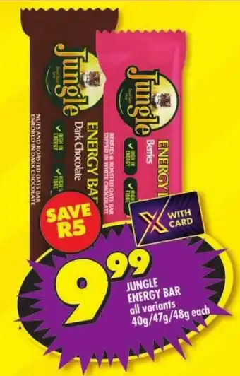 This special is available in various stores, view all products to get the cheapest Jungle energy bar. If you'd like to find out whether this product has a bigger discount in another store, check the category 'Grocery stores'. You may also find these specials interesting: Jungle Energy Bar, Jungle Energy Bar & Jungle Energy Bar Assorted 40/48g.