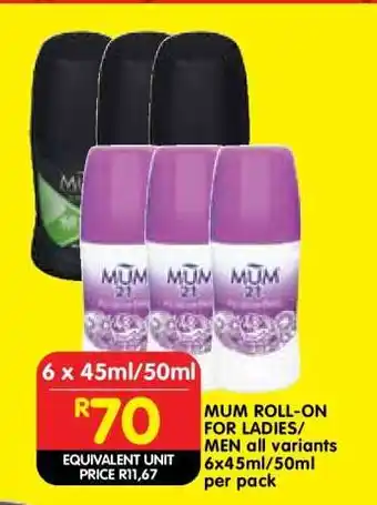 Now on special at Shoprite: MUM ROLL-ON FOR LADIES/MEN all variants 6x45ml/50ml per pack ✅ Valid from 5-01 to 18-01.