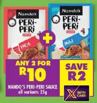 Shoprite offers a wide collection of products, besides the Nando's peri-peri sauce. Keep an eye on the weekly Shoprite catalogue to find the best specials and promotions. Besides Nando's peri-peri sauce, you can also find the following offers: NANDO'S Peri-Peri Sauce Sachet Assorted, Nando's Peri-Peri Sauce Sachet Assorted & Nando's Perinaise or Peri-Peri Sauce Asstd..