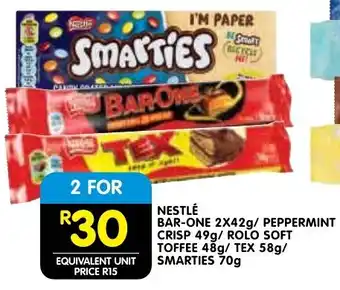 Nestlé bar-one/ peppermint crisp/ rolo soft toffee/ tex/ smarties promotion at Shoprite