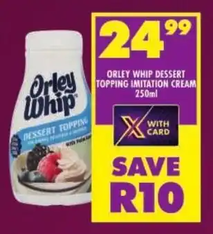 This special is available in various stores, view all products to get the cheapest Orley whip dessert topping imitation cream. If you'd like to find out whether this product has a bigger discount in another store, check the category 'Grocery stores'. You may also find these specials interesting: Orley whip dessert topping, Clover Fresh Cream, Sour Cream or Orley Whip Dessert Topping & Clover Fresh Cream, Sour Cream or Orley Whip Dessert Topping 250ml Each.