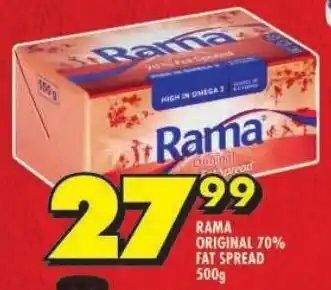 This special is available in various stores, view all products to get the cheapest Rama original 70% fat spread. If you'd like to find out whether this product has a bigger discount in another store, check the category 'Grocery stores'. You may also find these specials interesting: Rama Original 70% Fat Spread, Rama Original 70% Fat Spread Brick & Rama Original 70% Fat Spread Brick.