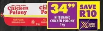 Shoprite offers a wide collection of products, besides the Ritebrand chicken polony. Keep an eye on the weekly Shoprite catalogue to find the best specials and promotions. Besides Ritebrand chicken polony, you can also find the following offers: Ritebrand french/ chicken polony, RITEBRAND FRENCH/CHICKEN POLONY 2kg each & Ritebrand french polony.