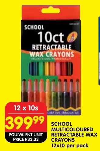 This special is available in various stores, view all products to get the cheapest School multicoloured retractable wax crayons. If you'd like to find out whether this product has a bigger discount in another store, check the category 'Grocery stores'. You may also find these specials interesting: School Retractable Wax Crayons, School Retractable Wax Crayons & SCHOOL RETRACTABLE WAX CRAYONS 10 per pack.