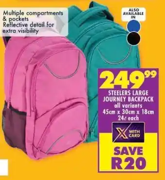 The price of STEELERS LARGE JOURNEY BACKPACK can be found at the top of the page, together with the dates during which the special is available. You can also check the price in the current Shoprite catalogue or on the Shoprite website. Promotional offers assure you of buying Shoprite products at the lowest price.