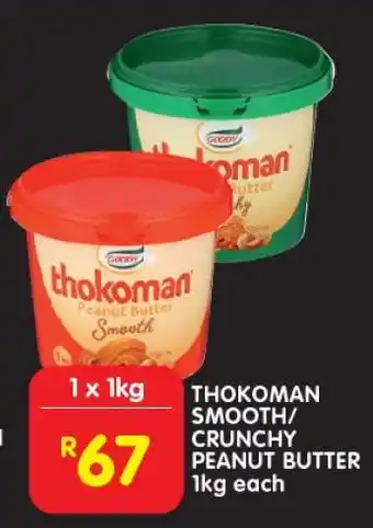 THOKOMAN SMOOTH/CRUNCHY PEANUT BUTTER 1kg each promotion at Shoprite