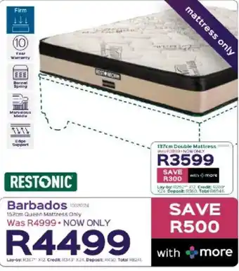 The price of Restonic Barbados 152cm Queen Mattress Only can be found at the top of the page, together with the dates during which the special is available. You can also check the price in the current Sleepmasters catalogue or on the Sleepmasters website. Promotional offers assure you of buying Sleepmasters products at the lowest price.