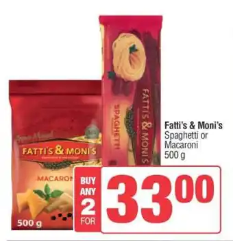 This special is available in various stores, view all products to get the cheapest FATTI'S & MONI'S Spaghetti or Macaroni. If you'd like to find out whether this product has a bigger discount in another store, check the category 'Grocery stores'. You may also find these specials interesting: Fatti's & Moni's Spaghetti or Macaroni 500g, Fatti's & Moni's Spaghetti or Macaroni 500g & Fatti's & moni's macaroni or spaghetti.