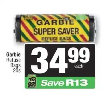 This special is available in various stores, view all products to get the cheapest Garbie Refuse Bags 20s. If you'd like to find out whether this product has a bigger discount in another store, check the category 'Grocery stores'. You may also find these specials interesting: Garbie Refuse Bags, GARBIE Super Saver Refuse Bags & Garbie Black Refuse Bags on a Roll.