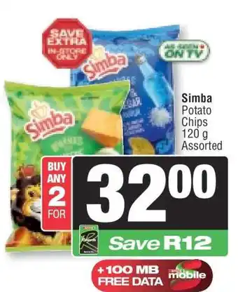 This special is available in various stores, view all products to get the cheapest SIMBA POTATO CHIPS. If you'd like to find out whether this product has a bigger discount in another store, check the category 'Grocery stores'. You may also find these specials interesting: Simba Potato Chips, Simba Potato Chips Assorted & SIMBA Potato Chips.