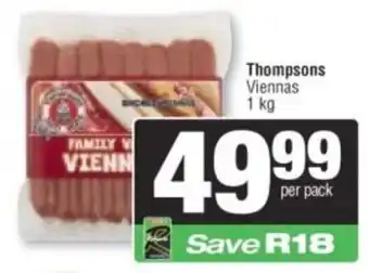 This special is available in various stores, view all products to get the cheapest Thompsons Viennas. If you'd like to find out whether this product has a bigger discount in another store, check the category 'Grocery stores'. You may also find these specials interesting: Thompsons viennas assorted, Thompsons Smoked/ Chicken Viennas & Sun Africa Viennas.
