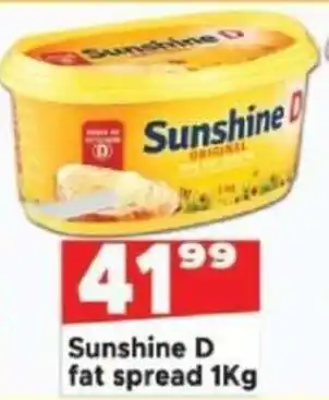 This special is available in various stores, view all products to get the cheapest Sunshine D fat spread. If you'd like to find out whether this product has a bigger discount in another store, check the category 'Grocery stores'. You may also find these specials interesting: SUNSHINE D Original Margarine 80% Fat Spread Brick, SUNSHINE D LITE/ORIGINAL FAT SPREAD 1kg each & SUNSHINE D Original Margarine 80% Fat Spread Brick.