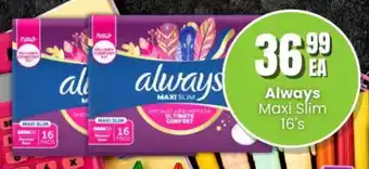 This Always Maxi Slim is currently part of a special promotion at Super Save. All information regarding the current price, promotion terms, and validity period can be found on this page. You can also explore similar offers and promotions related to Always Maxi Slim, helping you make the best possible choice.