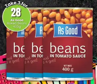 This special is available in various stores, view all products to get the cheapest As Good Baked Beans. If you'd like to find out whether this product has a bigger discount in another store, check the category 'Grocery stores'. You may also find these specials interesting: Koo Baked Beans, Real Baked Beans & Rhodes Baked Beans.