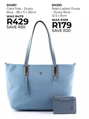 This special is available in various stores, view all products to get the cheapest SH287 Clara Tote Dusty Blue. If you'd like to find out whether this product has a bigger discount in another store, check the category 'Department Stores'. You may also find these specials interesting: SH293 Reah Ladies' Purse Dusty Blue, SH282 Natasha Tote Handbag & Addis 110Ltr Rough Tote (Blue Or Black) 754543/462844-Each.